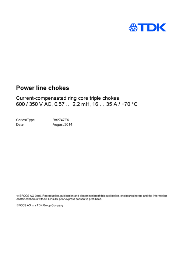 B82747E6203A40 Ind Power Line choke 1.5mH -30 to 50% 100KHz Ferrite 20A Pin