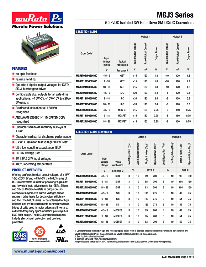 MGJ3T05150505MC-R13 Module DC-DC 3-OUT 15V/5V/5V 0.12A 1.8W/0.6W/0.6W 7-Pin SMD T/R