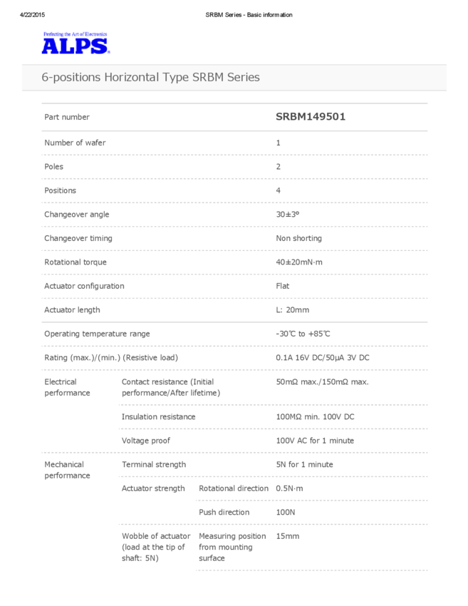 SRBM149501 Switch Rotary DP4T 4 Flatted Shaft PC Pins 0.1A 16VDC