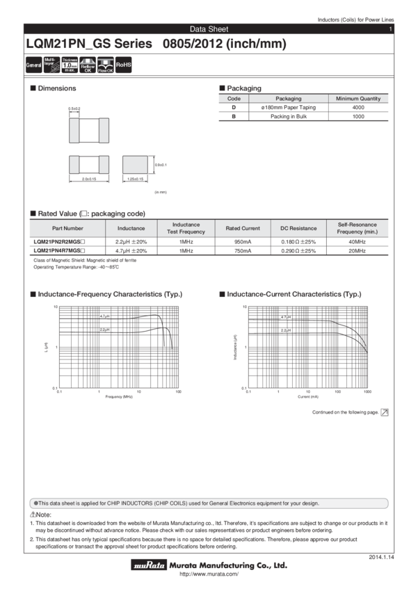 LQM21PN2R2MGSD Ind Power Chip Shielded Multi-Layer 2.2uH 20% 1MHz Ferrite 950mA 0805 Paper...