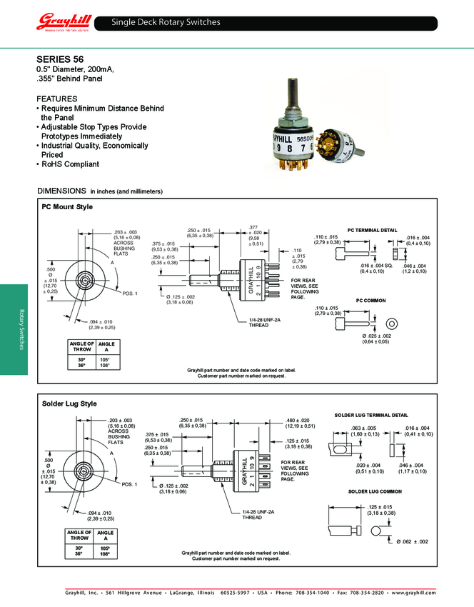 56SDP36S-01-2-AJS Switch Rotary SP12T 12 Flatted Shaft PC Pins 0.2A 115VAC 30VDC