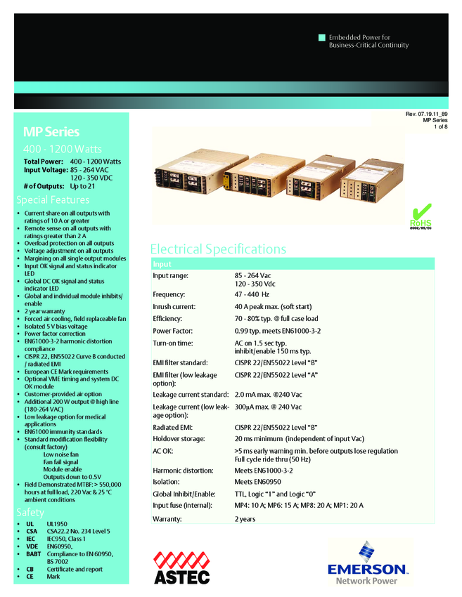 MP6-2W-1V-1Y-LLE-00 AC/DC Power Supply Triple-OUT 48V/42V/60V 7.5A/4.2A/3.5A 800W