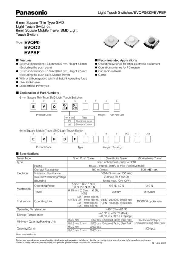 EVQQ2K01W Switch Tactile N.O. SPST Round Button J-Bend 0.02A 15VDC 0.6N SMD Embossed...