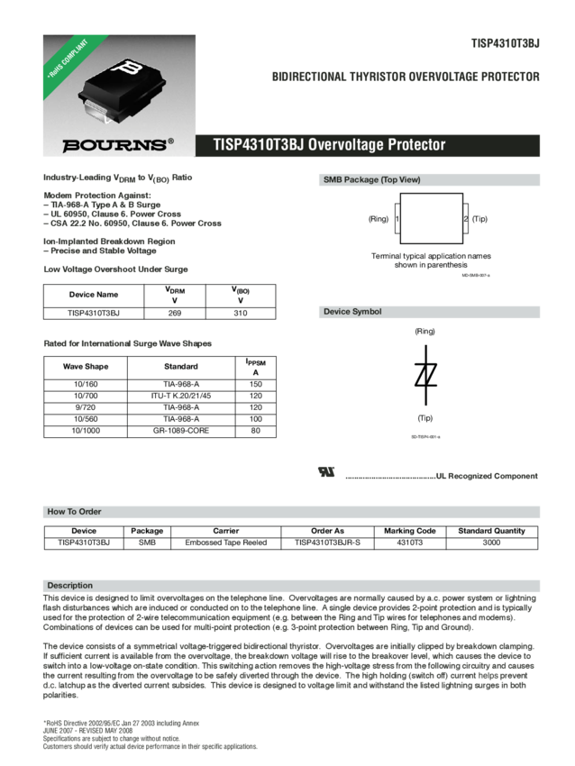 TISP4310T3BJR-S Thyristor TSPD 269V 30A 2-Pin SMB T/R