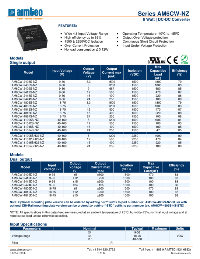 AM6CW-11015S-NZ Module DC-DC 1-OUT 15V 0.4A 6W 4-Pin DIP Tube