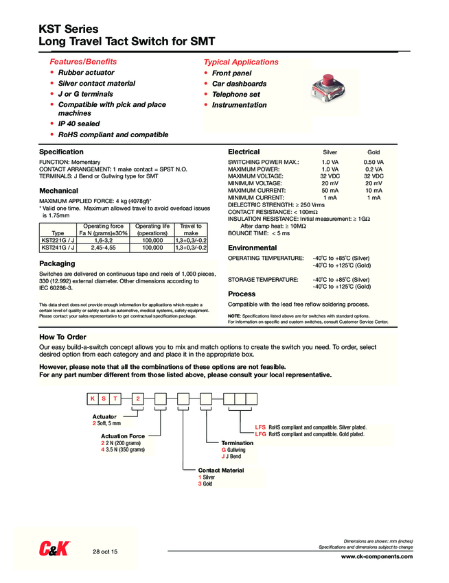 KST221GLFS Switch Tactile N.O. SPST Round Button J-Bend 0.01A 32VDC 0.5VA 100000Cycle...