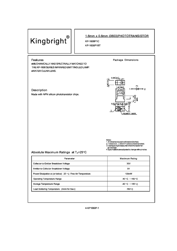 KP-1608P1C Phototransistor Chip Silicon 2-Pin SMD T/R