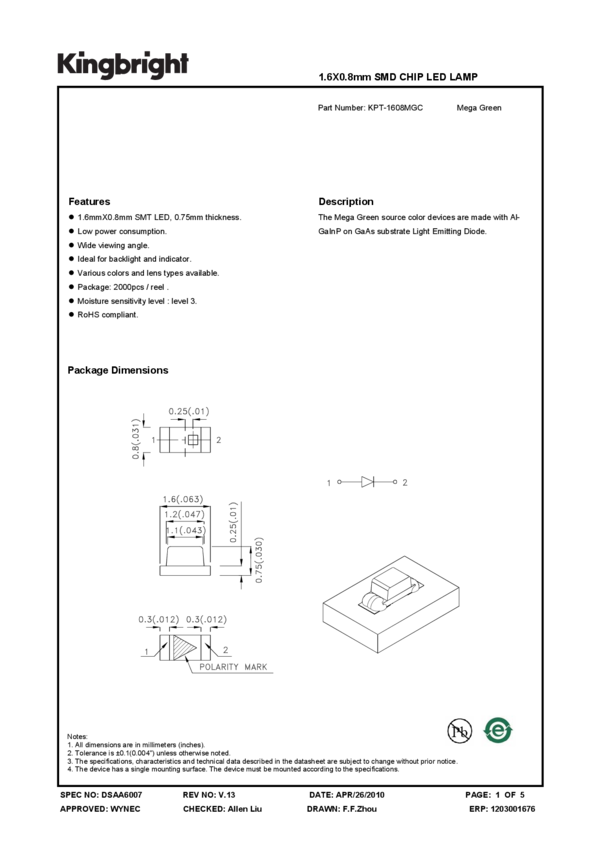KPT-1608MGC LED Uni-Color Green 574nm 2-Pin Chip LED T/R