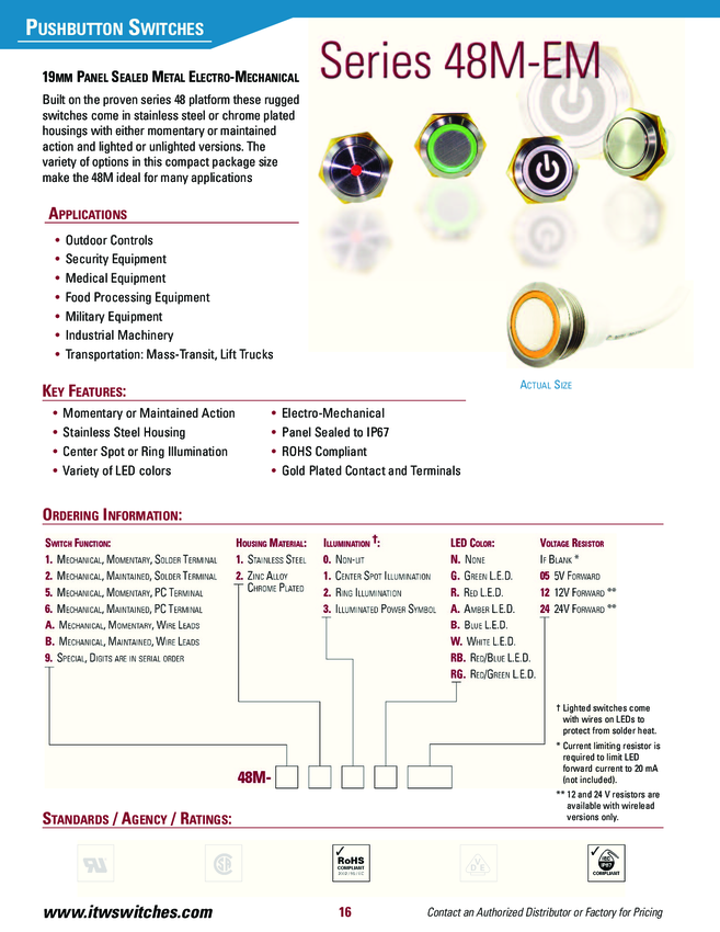 48M-A13B Switch Push Button N.O. SPST Round Button 0.25A 48VDC Maintained Contact So...