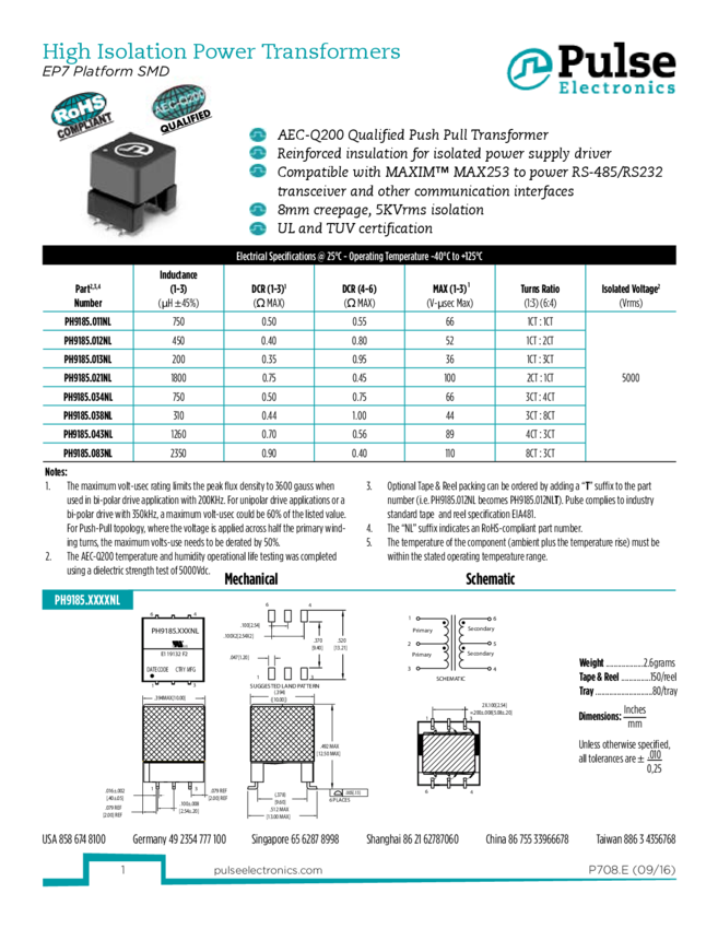PH9185.043NLT Power Transformer 4:3 Single Prim. Single Sec. 400V Prim. Surface Mount