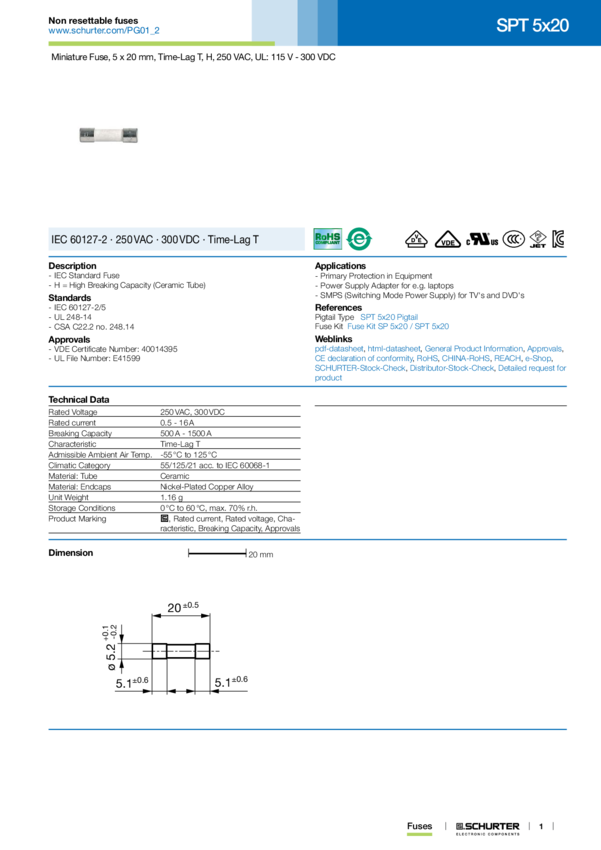 0001.2516.G FUSE, Cartridge, Non-resettable, Slow Blow, High Breaking Capacity, SP ø5.0...