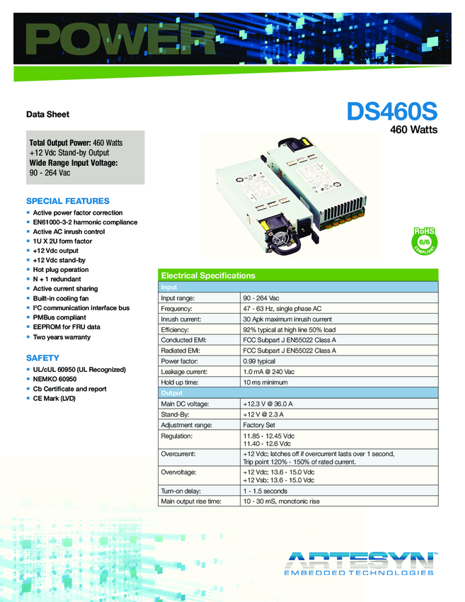 DS460S-3-003 AC/DC Power Supply Single-OUT 12.3V 36A 460W 29-Pin