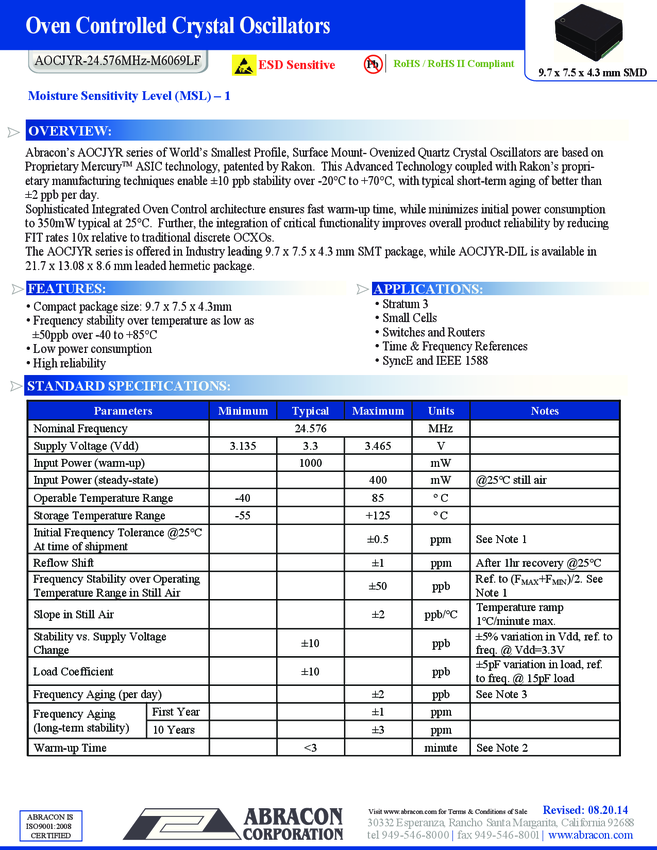 AOCJYR-24.576MHZ-M6069LF-T Controlled Oscillator 24.576MHz OCXO LVCMOS 4-Pin SMD T/R