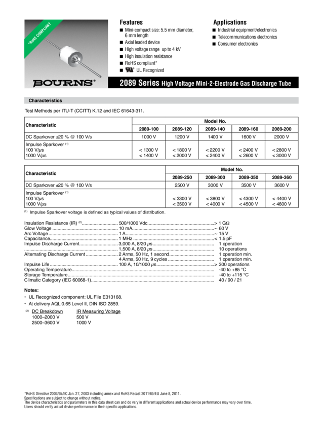 2089-250-BLF Surge Arrestor Mini-2-Electrode Gas Discharge Tube 2500VDC 3kA Thru-Hole Bu...
