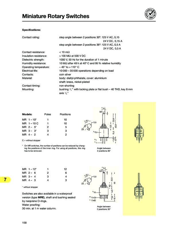 MR4-3 Switch Rotary 4P3T 3 Extended Shaft Turret 0.15A 125VAC 24VDC Miniature