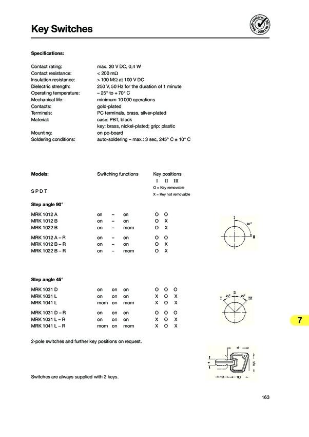 MRK1012A Switch Key Lock ON ON SPDT 90° Flat Key 20VDC 0.4VA PC Pins 10000Cycle Thru...