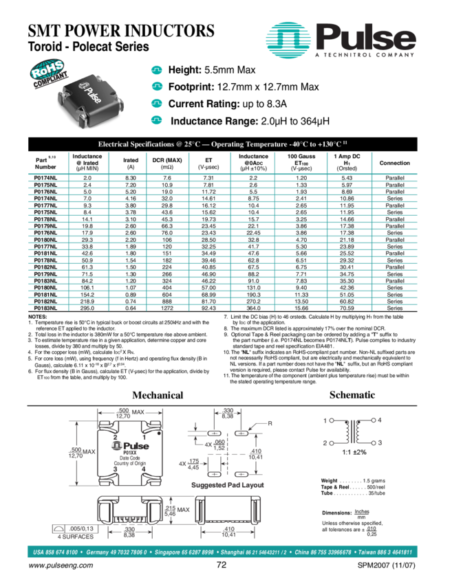 P0175NLT Ind Power Wirewound 2.2uH/8.75uH 10% 8.3A/4.16A T/R