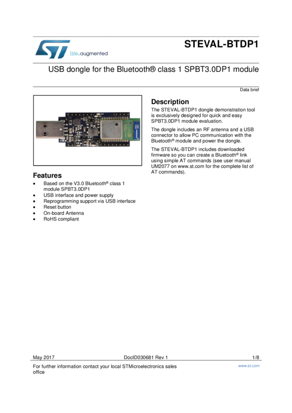 STEVAL-BTDP1 USB dongle for the Bluetooth® class 1 SPBT3.0DP1 module