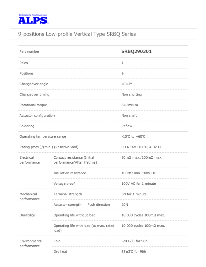 SRBQ290301 Switch Rotary SP9T 9 Flush Screwdriver Gull Wing 0.1A 16VDC T/R