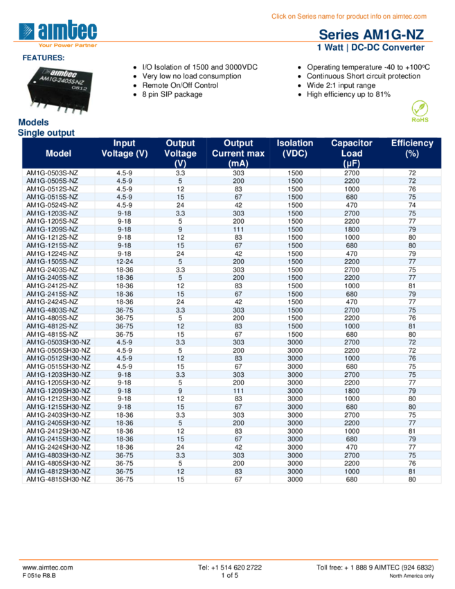 AM1G-2405SH30-NZ Module DC-DC 1-OUT 5V 0.2A 1W 7-Pin SIP Tube