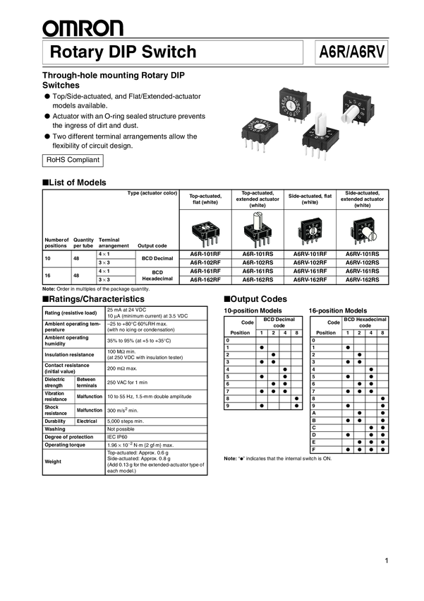 A6R-102RS Switch DIP SP10T 10 Extended Shaft 0.025A 24VDC PC Pins 2.54mm Thru-Hole Tu...