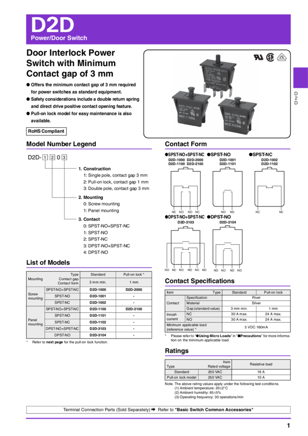 D2D1000 Electromechanical Switch Door Interlock Switch N.O./N.C. SP 16A