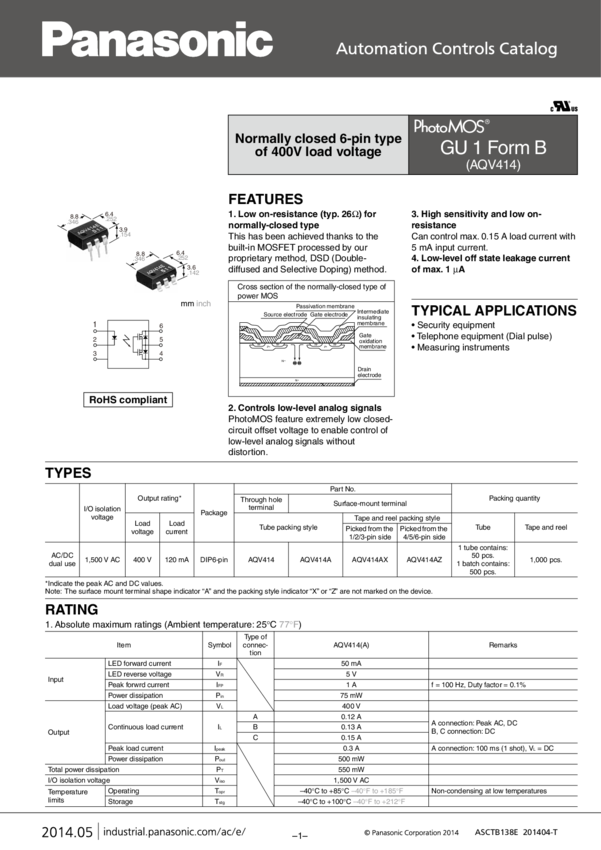 AQV414AZ Relay SSR 50mA 1.5V DC-IN 0.12A 400V AC/DC-OUT 6-Pin PDIP SMD T/R