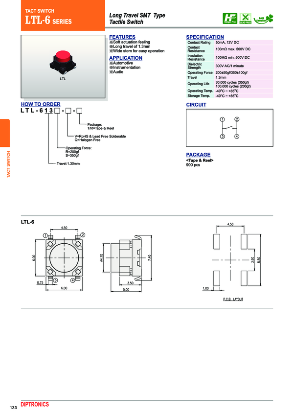 LTL-613S-V-T/R Switch Tactile N.O. SPST Round Button Flat 0.05A 12VDC 30000Cycles 3.43N SM...