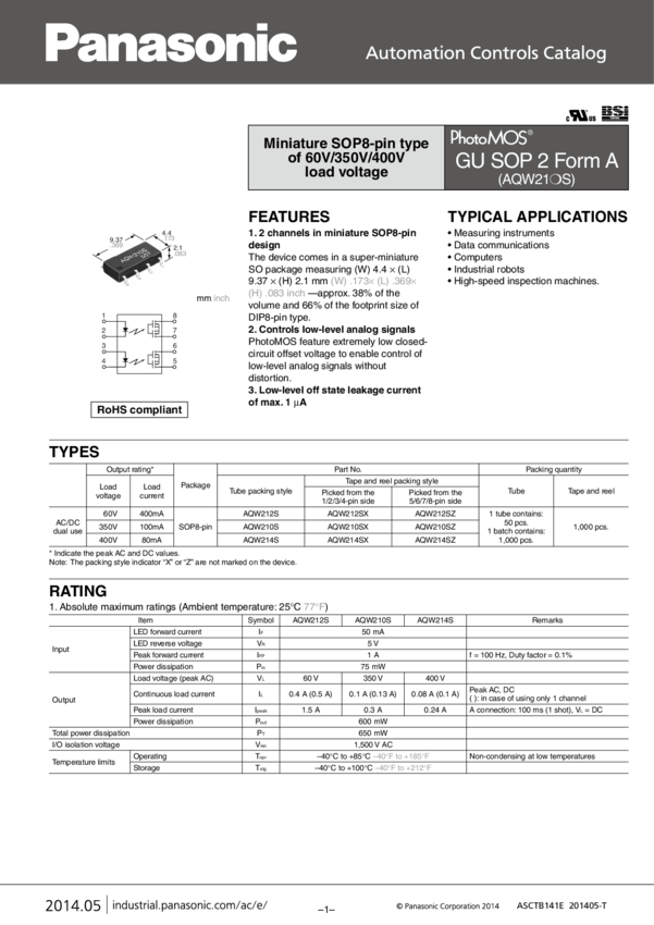 AQW214SZ Relay SSR 50mA 1.5V DC-IN 0.08A 400V AC/DC-OUT 8-Pin SOP T/R