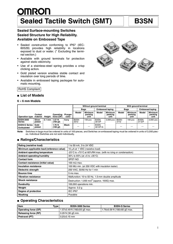 B3SN3112P Switch Tactile N.O. SPST Round Button J-Bend 0.05A 24VDC 50000Cycle 1.57N S...