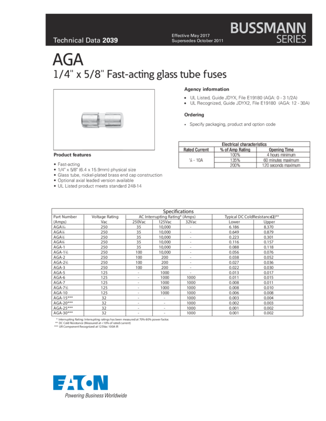 BK/AGA-1/2 Fuse Miniature 0.5A 125V Fast 2-Pin Cartridge Holder Bulk