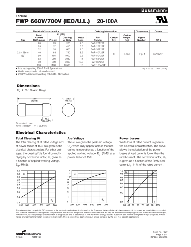 FWP-80A22F Fuse Miniature 80A 700V 2-Pin Cartridge Holder Carton