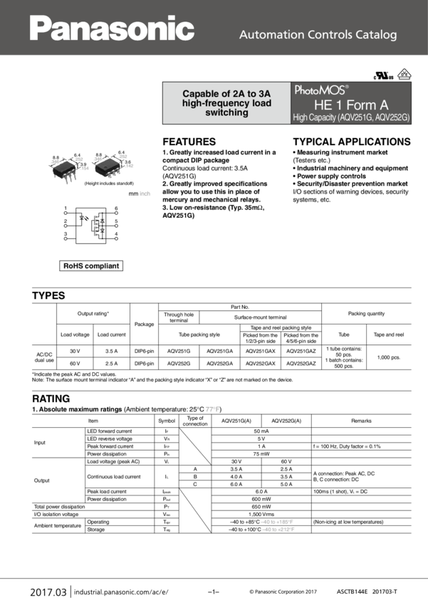 AQV252GAXJ Relay SSR 50mA 1.5V DC-IN 2.5A 60V AC/DC-OUT 6-Pin PDIP SMD T/R