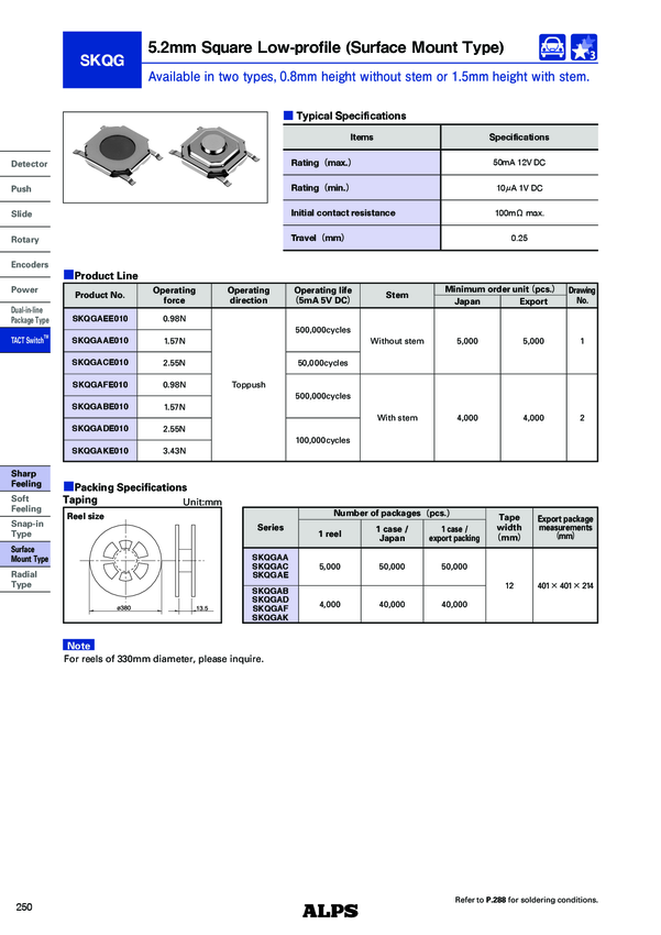 SKQGABE010 Switch Tactile N.O. SPST Round Button Gull Wing 0.05A 12VDC 1.57N SMD T/R