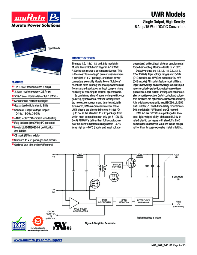 UWR-3.3/4250-D48AC DC/DC Power Supply Single-OUT 3.3V 4.25A 15W 6-Pin Case C14