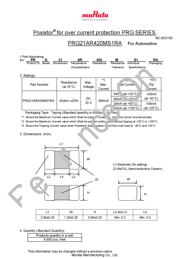 PRG21AR420MS1RA Thermistor PTC 42Ohm 20% 2-Pin 0805 Embossed T/R