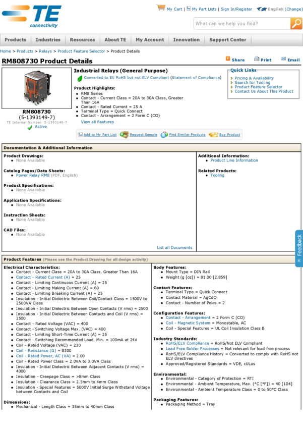 RM808730 Electromechanical Relay DPDT 25A 230VAC 7.5KOhm DIN Rail