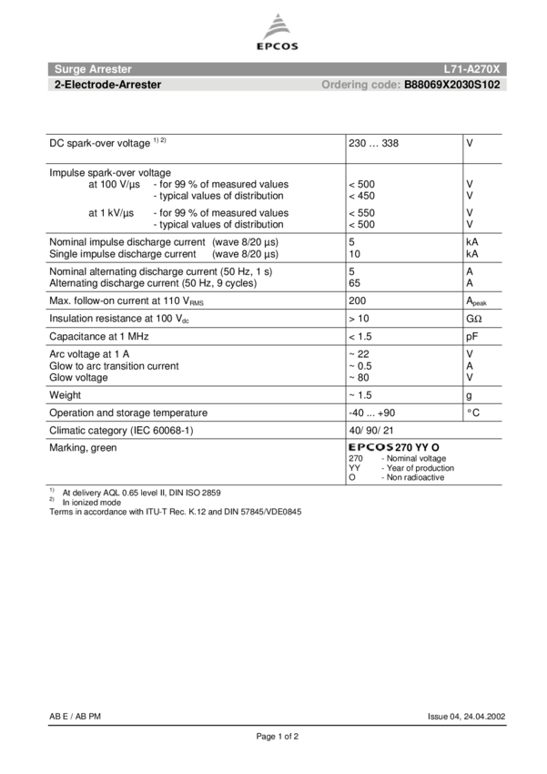 B88069X2030S102 Surge Arrestor 2-Electrode Surge Arrestor 338VDC 10KA Thru-Hole T/R