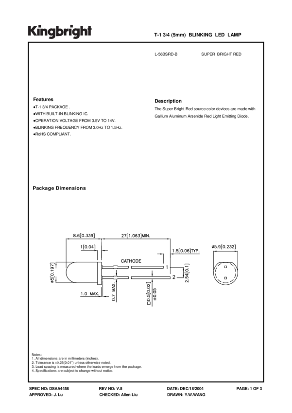 L56BSRD/B LED Uni-Color Red 660nm 2-Pin T-1 3/4