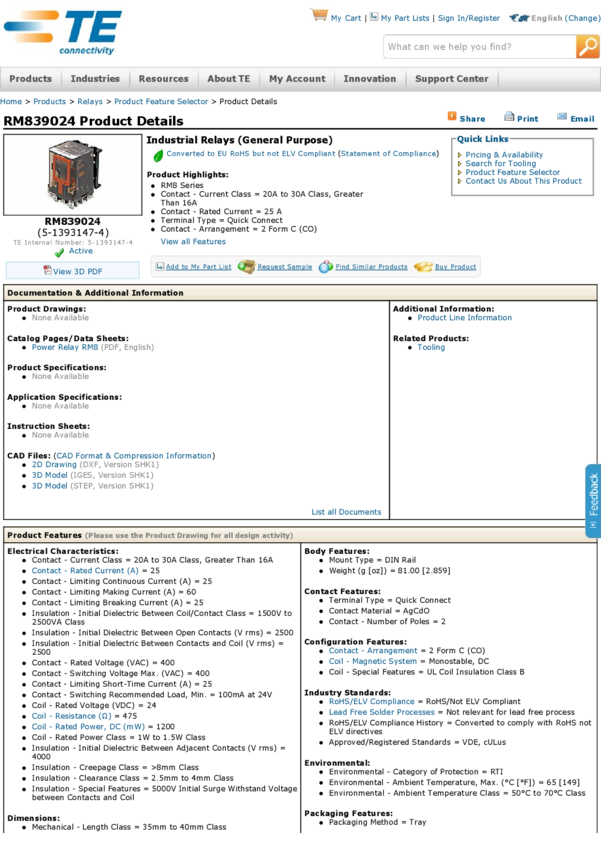 RM839024 Electromechanical Relay DPDT 25A 24VDC 475Ohm DIN Rail