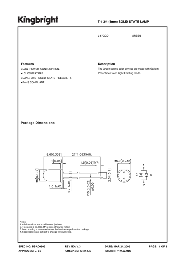 L-57GGD LED Uni-Color Green 565nm 2-Pin T-1 3/4 Box