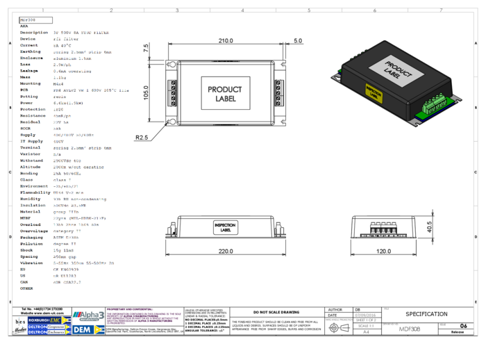 MDF308 Power Line Filter 50Hz/60Hz 8A 400VAC/480VAC Screw Chassis Mount