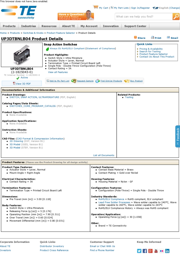 UP3DTBNLB04 Switch Snap Action N.O./N.C. SPDT Straight Lever PC Pins 3A 125VAC 0.29N Th...