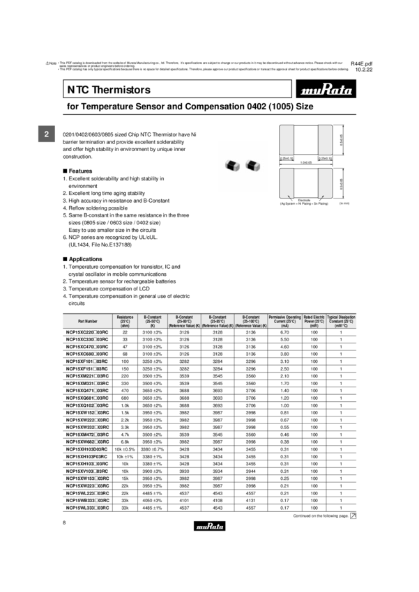 NCP15XH103D03RC Thermistor NTC 47000Ohm 0.5% 2-Pin 0402 Paper T/R