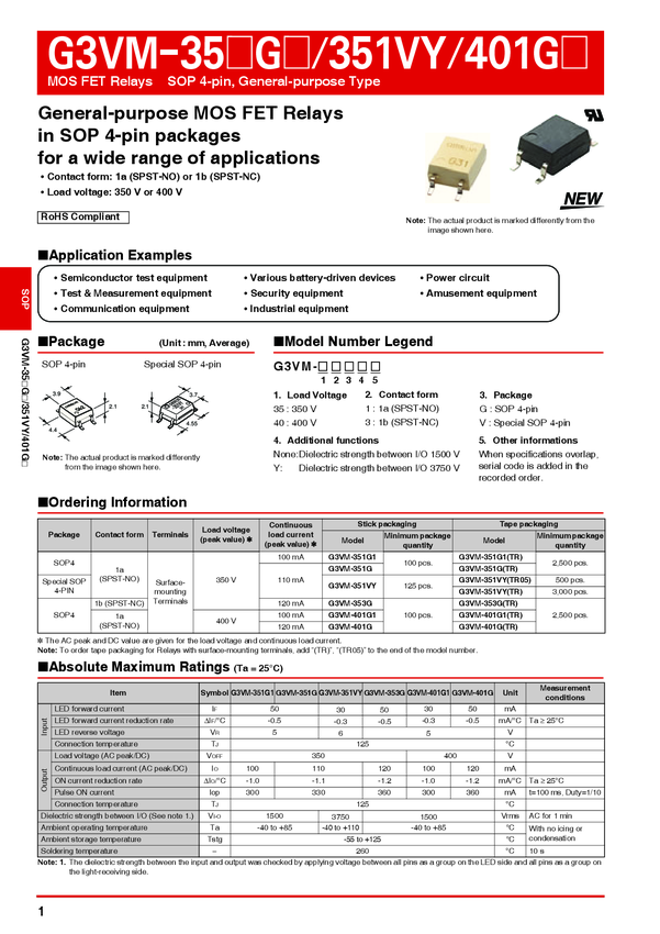 G3VM-351G1 Relay SSR 50mA 1.3V DC-IN 0.1A 350V AC/DC-OUT 4-Pin SOP