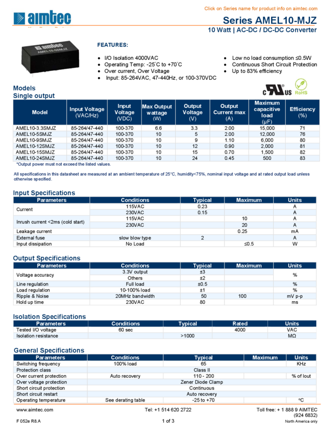 AMEL10-15SMJZ AC/DC Power Supply 1-OUT 5V 2A 10W 4-Pin