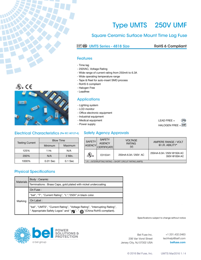 UMTS 2 Fuse Chip 2A 250V Slow Blow 2-Pin Solder Pad Surface Mount