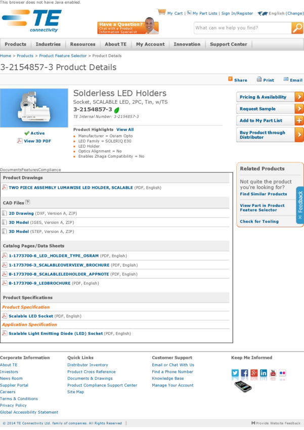 3-2154857-3 Solderless LED Sockets With Operating Voltage VDC 250