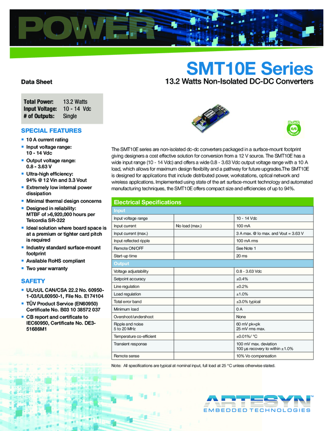 SMT10E-12W3V3J Module DC-DC 1-OUT 0.8V to 3.63V 10A 33W 6-Pin SMT Tray