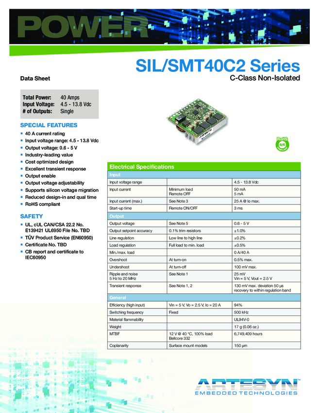 SIL40C2-00SADJ-VJ Module DC-DC 1-OUT 0.6V to 5V 40A 11-Pin SIL